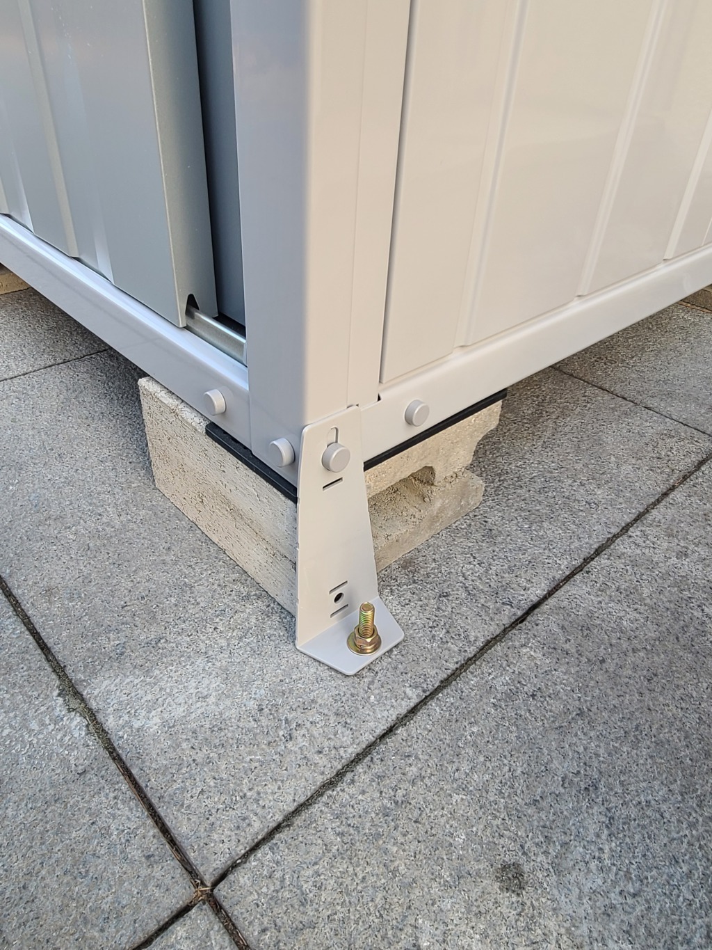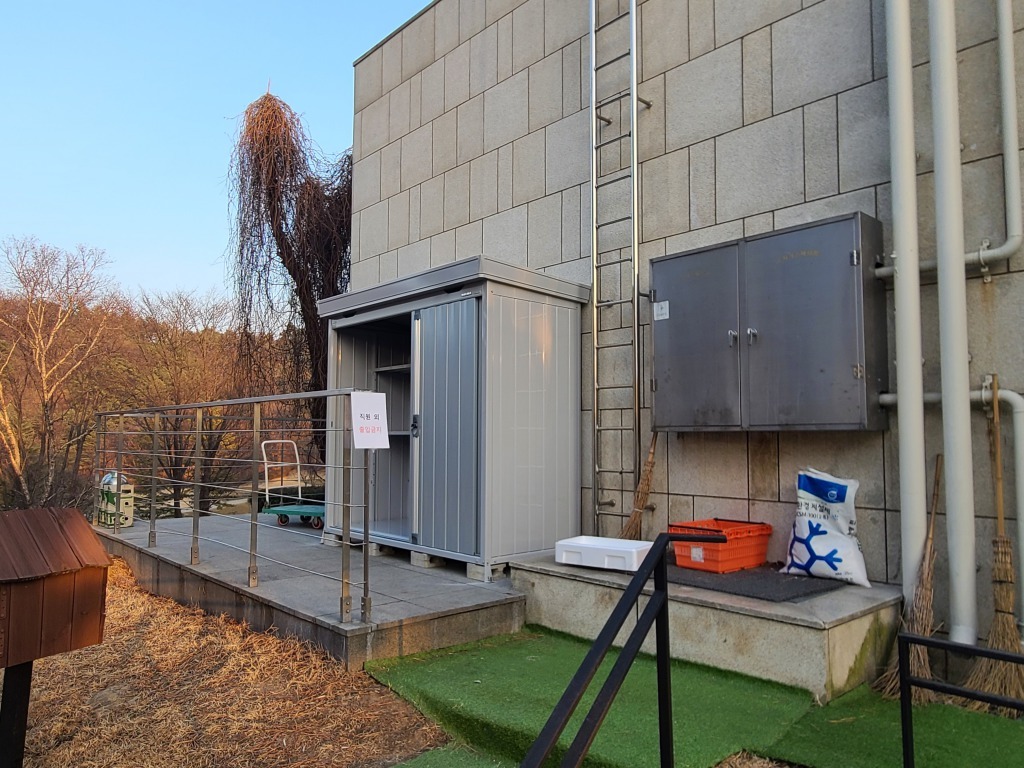 ** 바닥이 흙/잔디/파쇠석의⇒ 각 모서리에(4군데) 땅을 파서 앙카를 묻고 모르타르를 부어 굳힘
