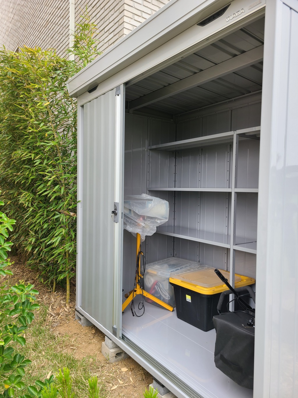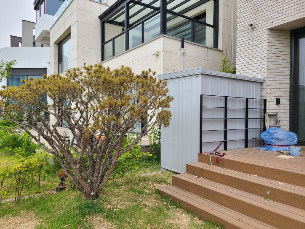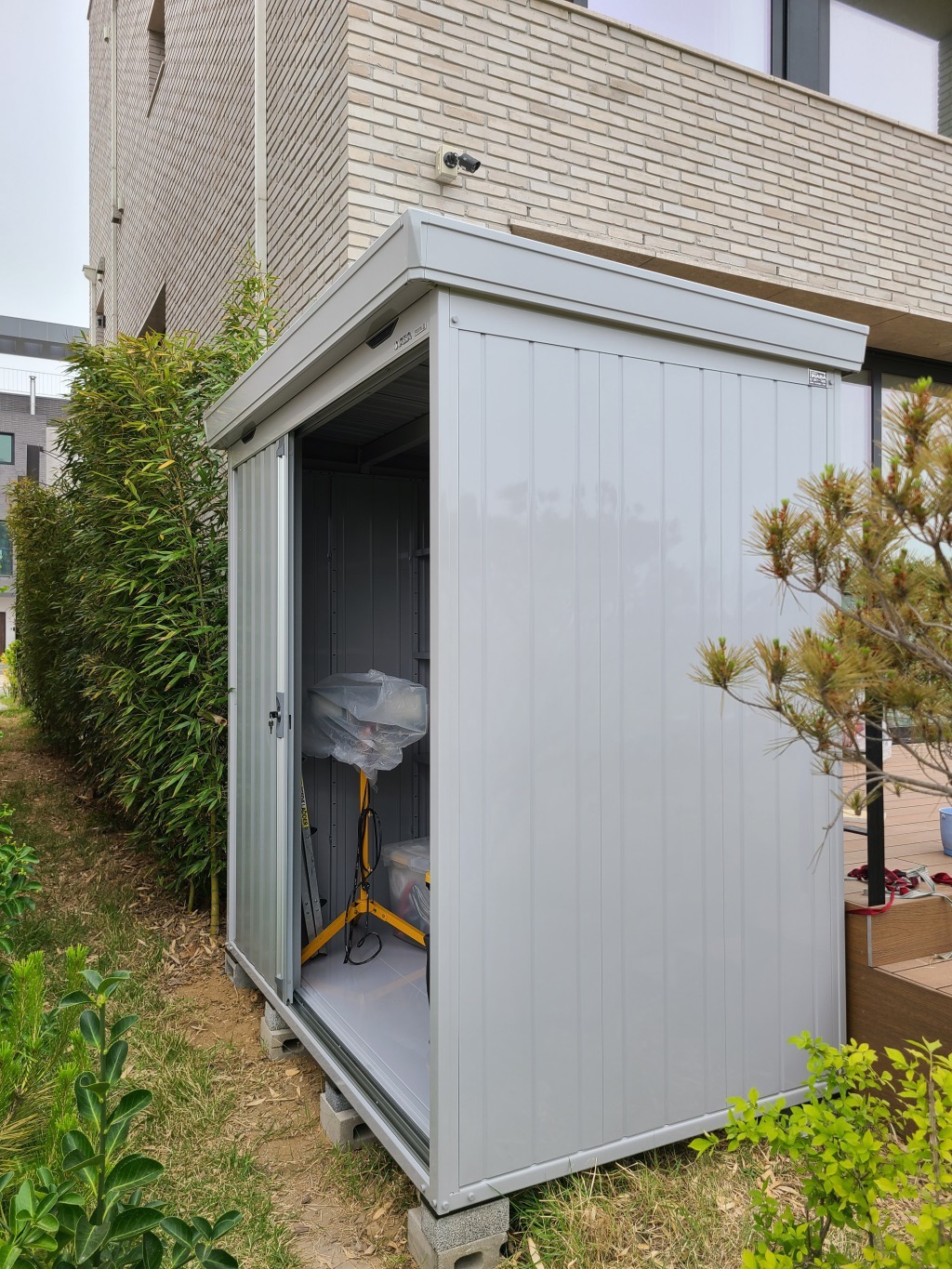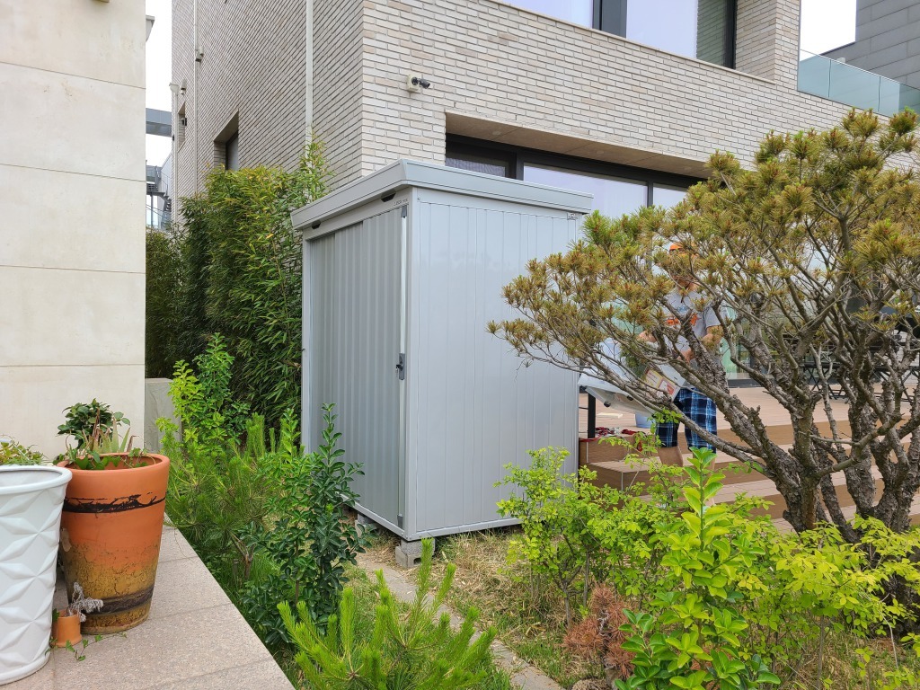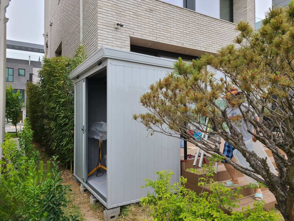창고의 수평 작업을 위해 하부에 벽돌을 두고(제품에 따라 벽돌의 숫자는 달라요)