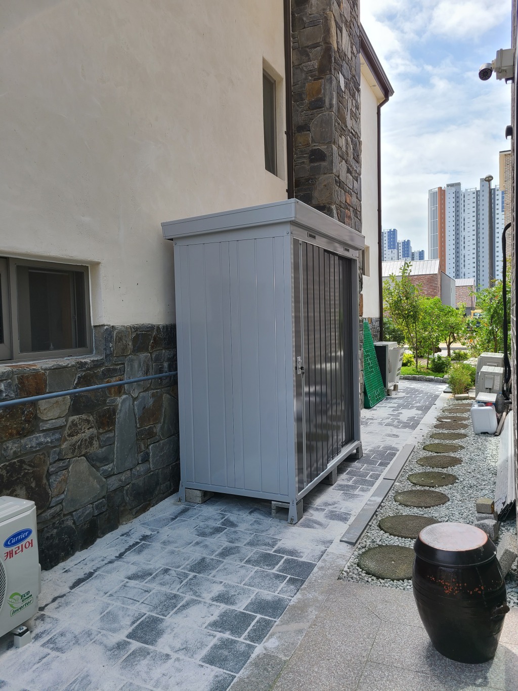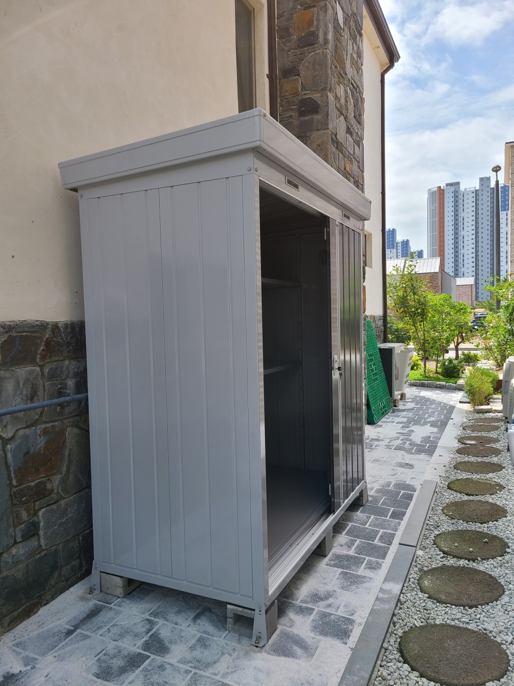 시흥에 설치한 보관용 조립식창고 NXN-17S 1790* 950* ( 0.52평 )이며, 프리미엄 그레이 (PG) 색상의 문 입니다.