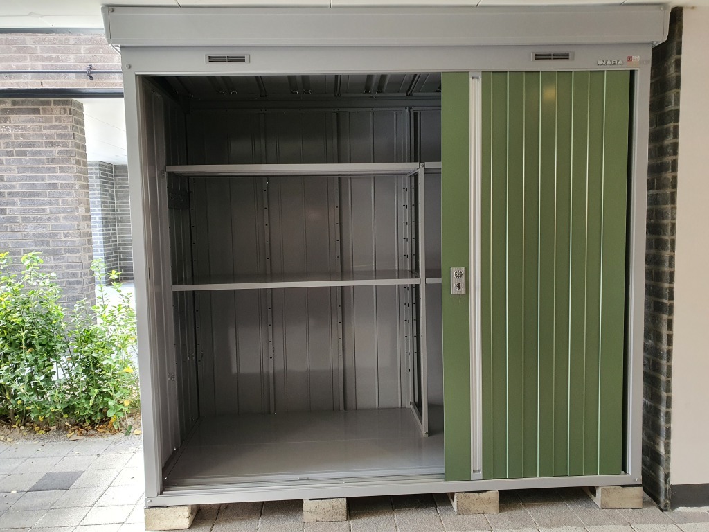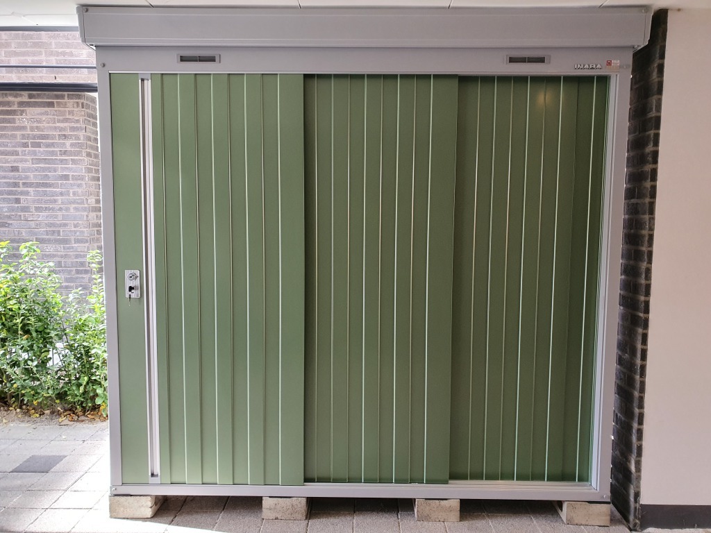 파주 전원주택단지 내 개인 보관용창고 NXN-21S 2210* 950* ( 0.64평 ) 크기이며, 그린 ( OG ) 색상의 문 입니다.