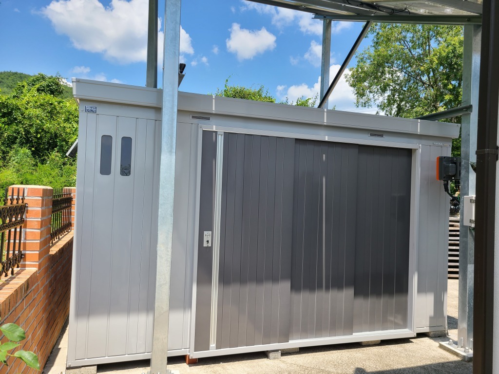 포항 북구에 설치한 조립식창고 NXN-77S 3470* 2210* ( 2.37평 )이며, 프리미엄 그레이 ( PG ) 색상의 문 입니다.
