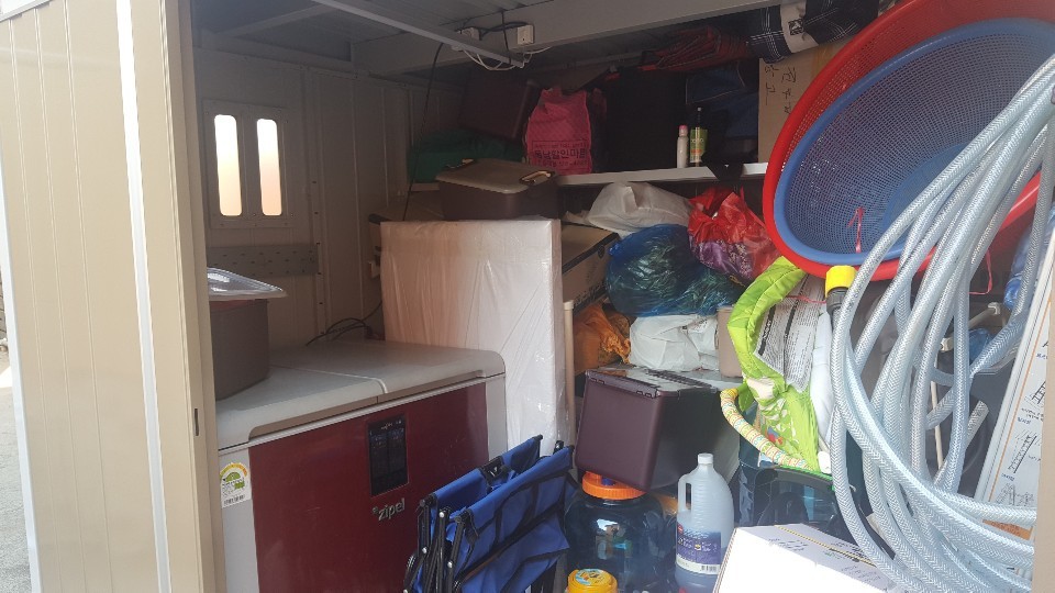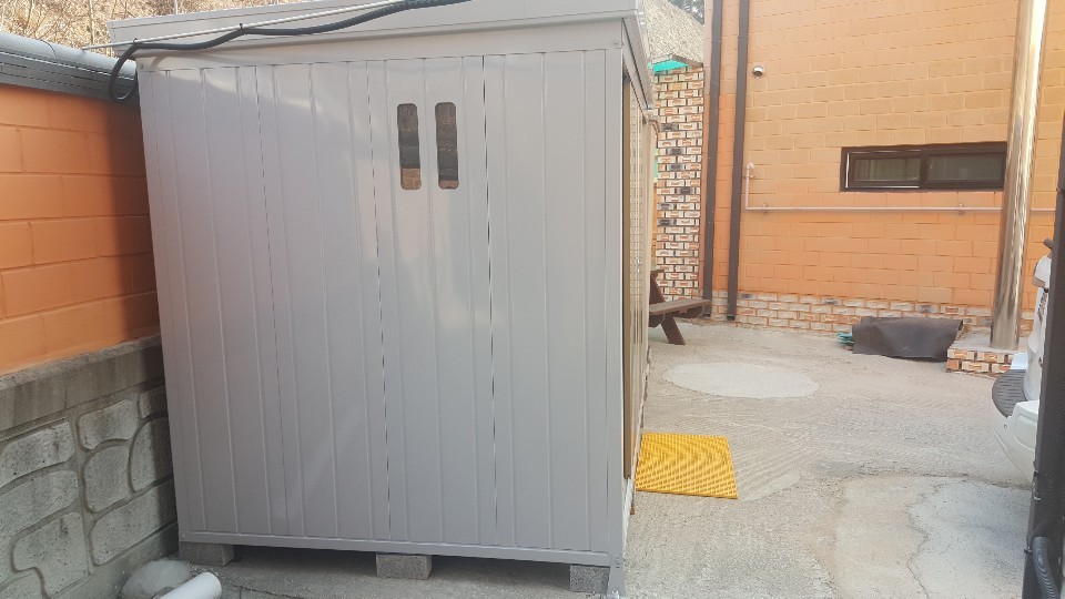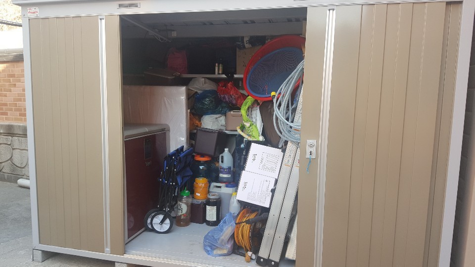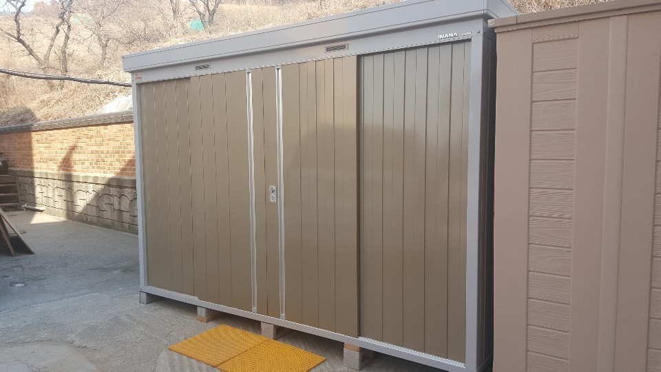 ●단점으로는-> 물건을 넣다보니 공간이 부족하다는 생각이 들어서 좀더 큰걸 했어야 했나 하는 아쉬움이 살짝 생겼구요!! 창고를 받치는 고임받침대중 창고문 바로밑에 있는것이 들떠서 움직이는거 같았습니다.!. 물건이 들어가니 힘을 다른쪽으로 받아서 살짝 휜것인지 의심스러울 정도 이지만, 그래도 사용하는데는 괜찮네요~ 녹슬걱정없이 전반적으로 아주 만족하며 잘 사용중입니다. 물건이 많고 정리가 아직 되지않아 창고내부가 지저분하네요 ㅜㅜ 창고 구매계획이 있으시다면 사용용도에 따라서 규격사이즈 한번더 확인하시구 구매하시는 것도 괜찮으실꺼 같네요~~ㅎㅎㅎ